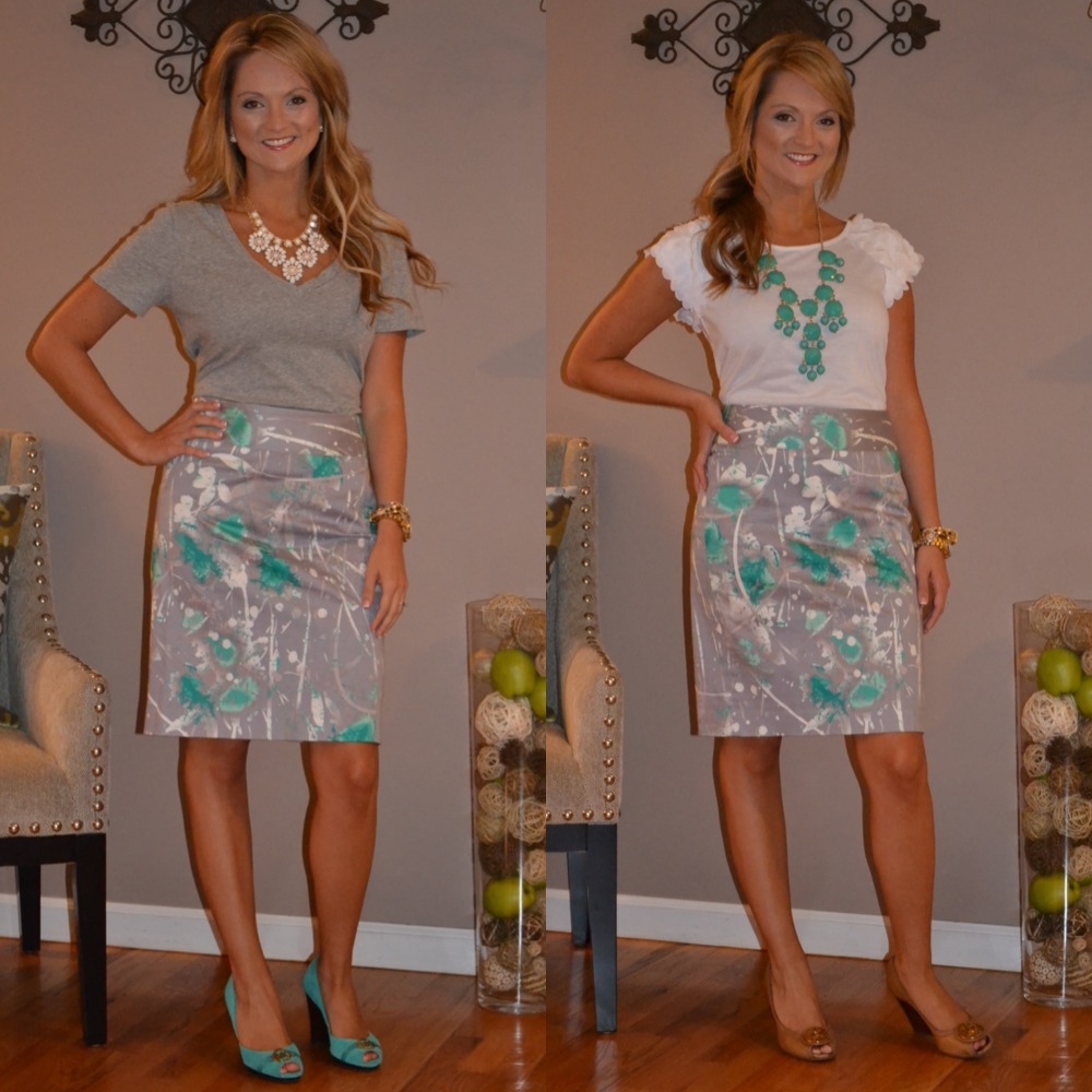 This is one of my favorite skirts for work wear. I love turquoise so any way I can get it makes me happy. I always pair it with a white top and a turquoise statement necklace but am trying to step out a little with the gray top. Plus I got to try one of my favorite new trends, wearing two statement necklaces at once! I still favor the white but I think it has everything to do with the necklace. What do you think?