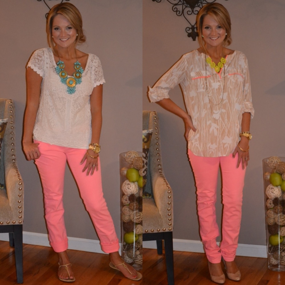 Today I’m featuring more chartreuse! It’s been one of my favorite colors this season and I think it’s going to continue for fall. The first look of course includes my favorite accessory the statement necklace. This look is simple but put together and what I think is a great color combo. The second look features my second favorite accessory, the infinity scarf! This scarf actually inspired the coral/chartreuse color combo for the entire outfit. The scarf also helps the outfit transition into fall while still keeping the colors bright. Which look is your favorite?