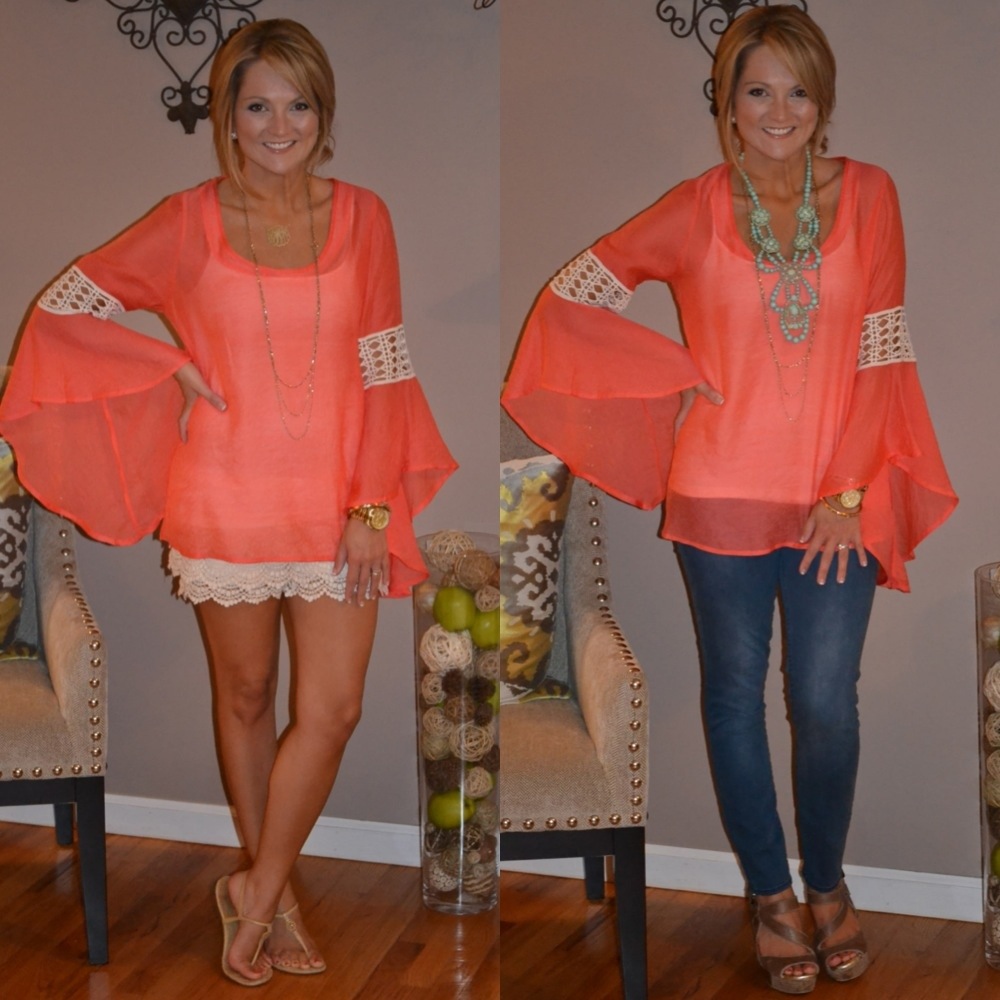 The annual Willow Tree tent sale starts today and boy oh boy is it amazing this year!! All items under the tent will be $20 and under, plus $20 select Miss Me and 50 – 60% off select Miss Me, like the ones I have on below. I just couldn’t resist this bright coral color and already knew I wanted to add turquoise for a colorful summer outfit. I also dressed the skinnies up with a flowy top and a punch of yellow for a date night look. Let me know which is your favorite and don’t miss the big sale Friday and Saturday at The Willow Tree!!!!
