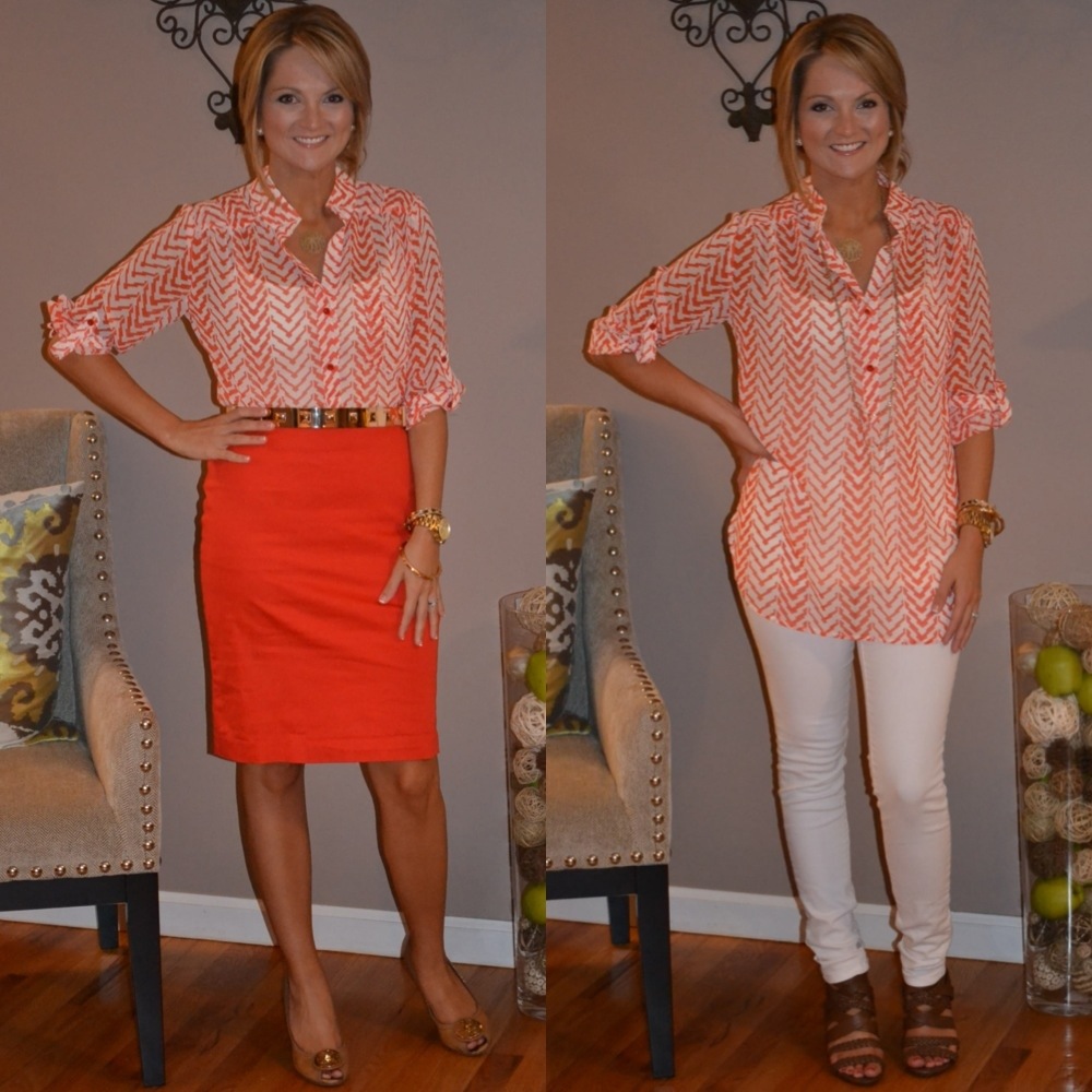 Chevron, chevron, chevron. It’s everywhere! And guess what..it’s sticking around for fall! Today I’m showing a little variation of the chevron top. I like this pattern because it’s not quite as bold as some of my other pieces. If you’re like me you need pieces that can be versatile in your wardrobe. This top works great for work or casual. I first paired the top with a pencil skirt, of course it doesn’t have to be as “matchy” as this look. I do like the monotone effect but pairing it with a neutral like khaki would be adorable too! The second look I love because it’s so easy but still looks really put together. It’s perfect to throw on your favorite jewelry pieces and head out. You could also do a denim skinny or jegging here with a flat or a heel. Which look is your favorite?